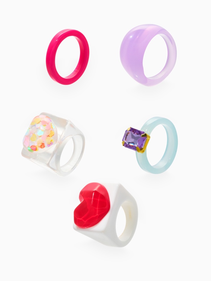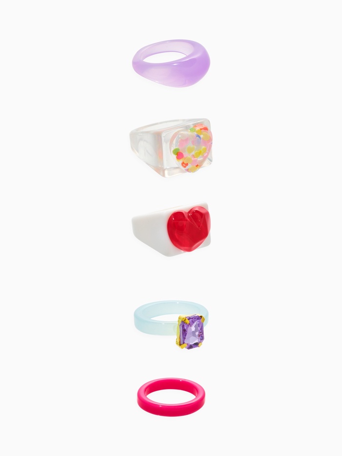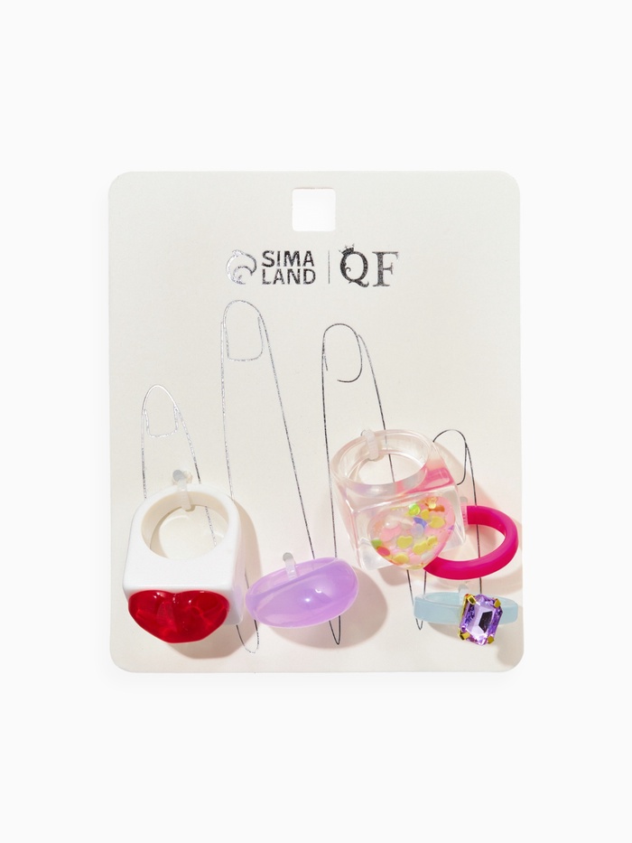 Этот набор из пяти колец — идеальное решение для женщин, которые ценят яркие акценты и искреннюю нежность в повседневных образах. Каждое кольцо украшено сердечками, выполненными из пластика с разноцветными вставками из полистоуна, что придает аксессуарам насыщенность и искрометность. Размер МИКС (17–19) обеспечивает универсальную посадку, позволяя выразить индивидуальность и добавив нотки игривости в любой лук.