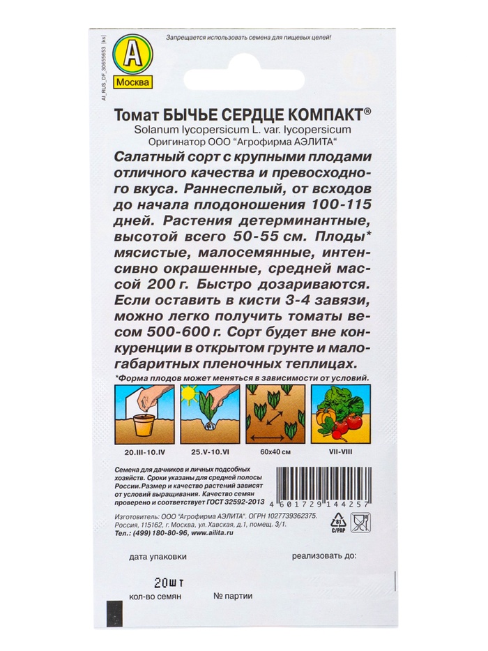Набор семян Томат раннеспелый и низкорослый «Бычье сердце компакт», 20 шт. семян