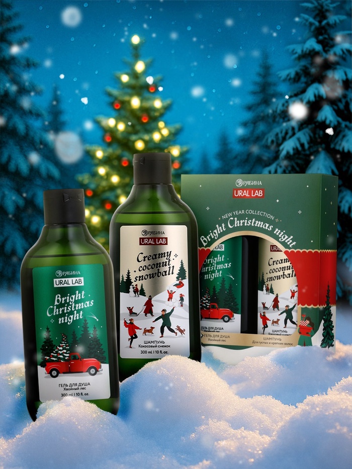 Новогодний подарочный набор косметики Bright Christmas night: гель для душа и шампунь для волос 2×300 мл, URAL LAB