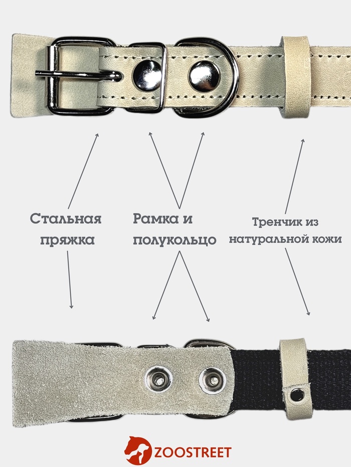 Усиленный ошейник выполнен из сыромятной кожи и дополнен внутренним слоем из брезента. Белый цвет придаёт лаконичный вид, а ширина 2,5 см обеспечивает надёжную фиксацию для собак с обхватом шеи от 35 до 46 см.