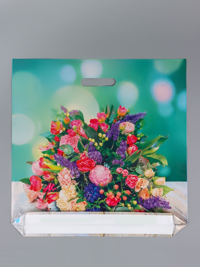 Букет в большом формате. Пакет «Цветочная композиция» — это вместительная квадратная сумка с изображением пышного и разнообразного букета. Дизайн предлагает альтернативу одноцветковым мотивам, создавая образ щедрого и яркого подарка.