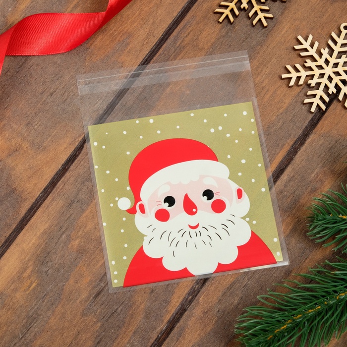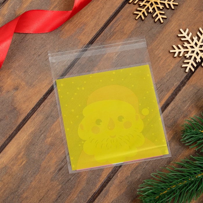Пакет БОПП с липкой лентой и новогодним дизайном размером 10x10x3 см станет отличным решением для упаковки подарков и сувениров.