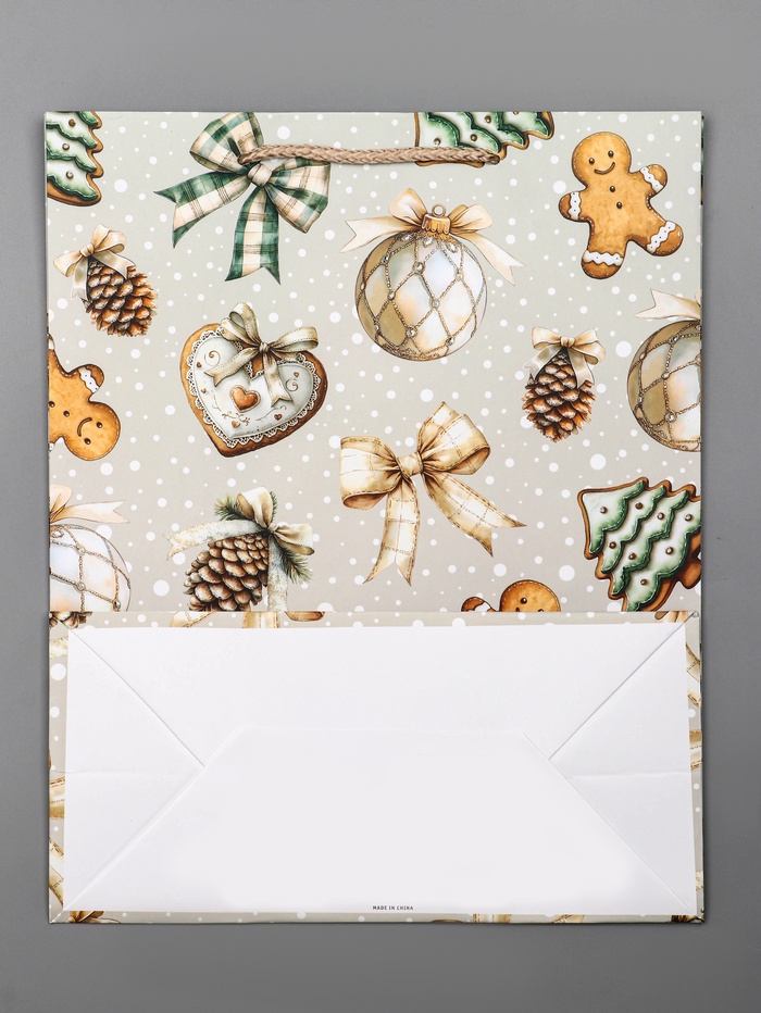 Создайте праздничное настроение с классикой зимнего декора! Большой новогодний подарочный пакет «Коллекция ёлочных игрушек» — это просторная упаковка с традиционным дизайном. Ламинированная поверхность и нейтральный бежевый фон подчеркивают ценность содержимого.