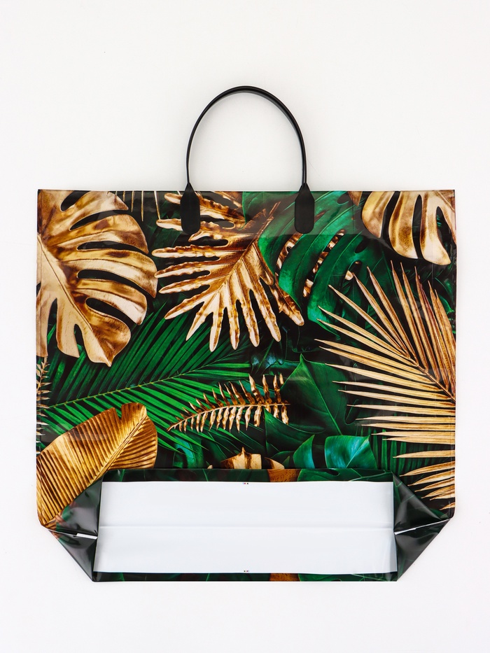 Роскошь природных мотивов! Подарочный пакет «Райский сад» с пластиковой ручкой — это изысканное решение для особенных подарков. Сочетание зеленого фона и золотистых растительных узоров создает атмосферу благородства.