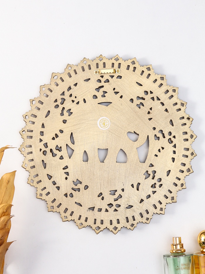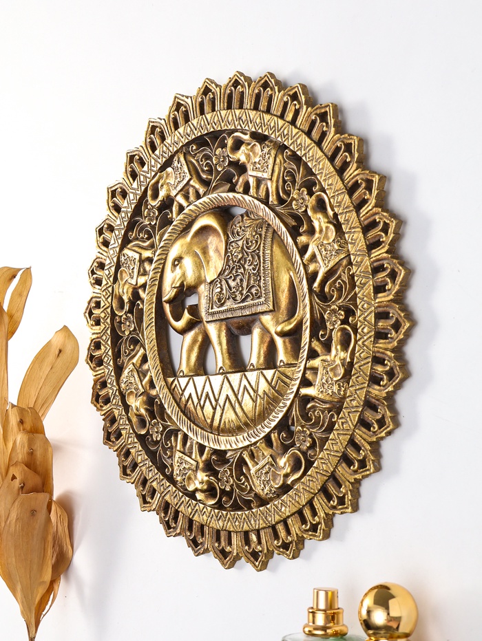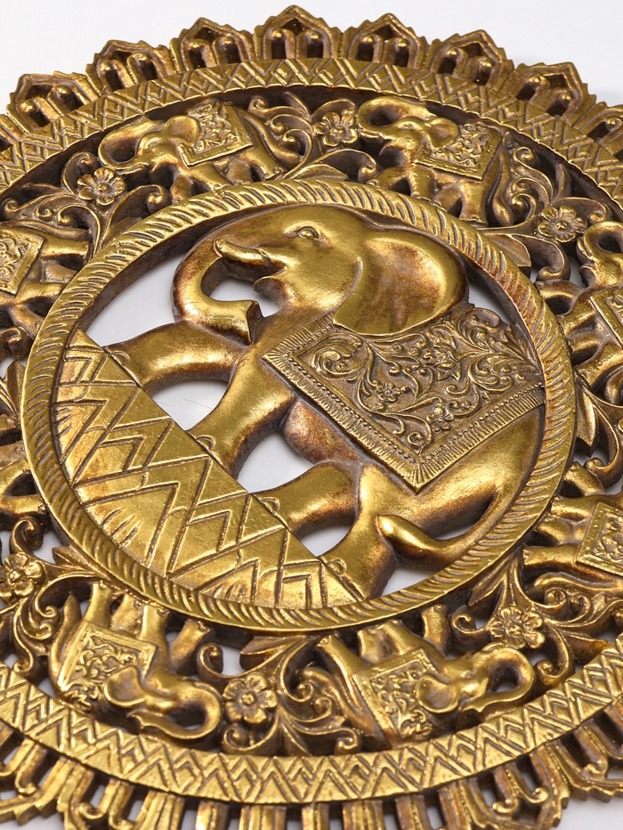 Это настенное панно с индийским слоном в золоте — образец спокойствия и мудрости для вашего интерьера. Сложный орнамент мандалы, обрамляющий благородное животное, создаёт медитативный фокус в комнате, привнося гармонию и ощущение защищённости. Идеальный акцент для пространства, где хочется отдохнуть душой.