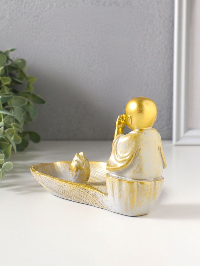 Подставка под благовония полистоун "Маленький послушник и лист" беж с патиной 18х10х10,5 см 10964