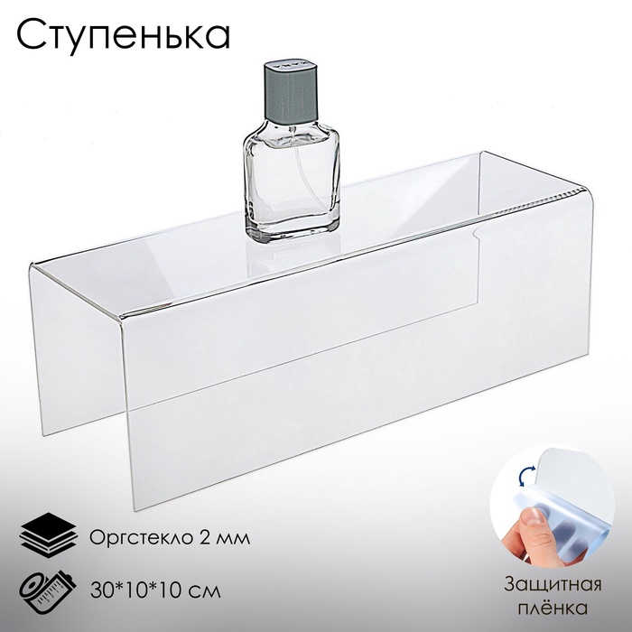 Простая и стильная горка с двумя ступеньками создаёт удобное расположение товаров для демонстрации. Размеры 30×10×10 см подходят для размещения товаров разного размера и формы. Подставки из оргстекла (листовой акрил). Благодаря использованию 100% акрила, подставки имеют идеальную прозрачность, высочайший блеск и шикарный внешний вид. ВНИМАНИЕ: Изделия поставляются в матовой защитной плёнке, белого, синего, зелёного или прозрачного цвета, которую необходимо удалить перед оценкой качества или перед использованием.