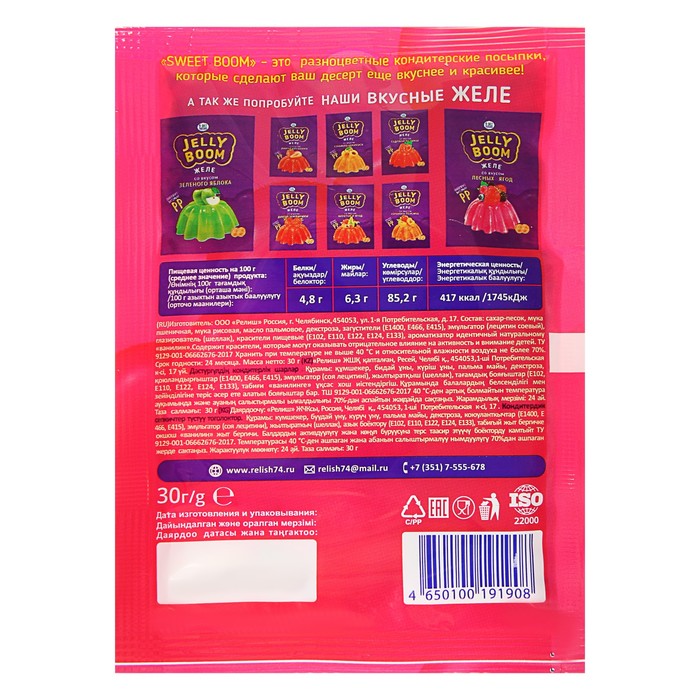 Область применения: декоративные кондитерские посыпки наносят на поверхность готовых изделий (тортов, пирожных, кексов, рулетов, мороженого, шоколадной глазури, сахарной помадки, сдобы и бубликов и других) для придания им красивого внешнего вида.