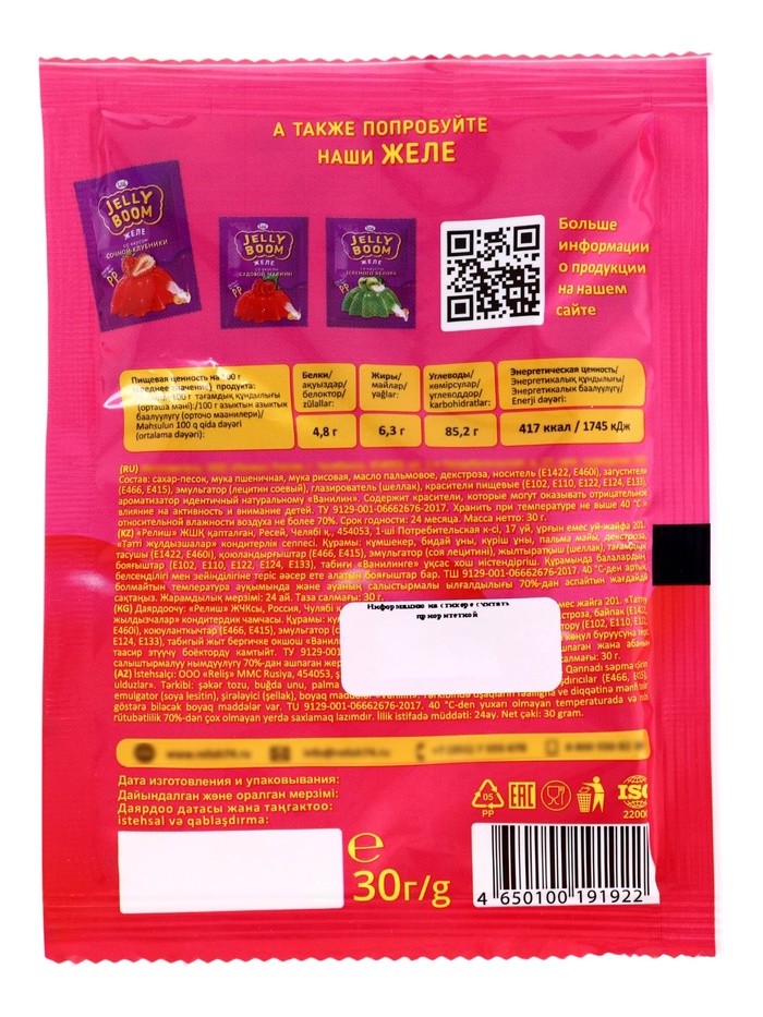 Состав: сахар-песок, мука пшеничная, мука рисовая, масло пальмовое, декстроза, загустители (Е1400, Е466, Е415), эмульгатор (лецитин соевый), глазирователь (шеллак), красители пищевые (Е102, Е110, Е122, Е124, Е133), ароматизатор идентичный натуральному "Ванилин".