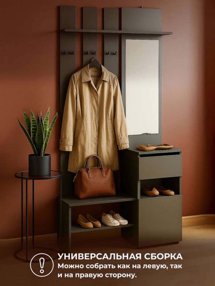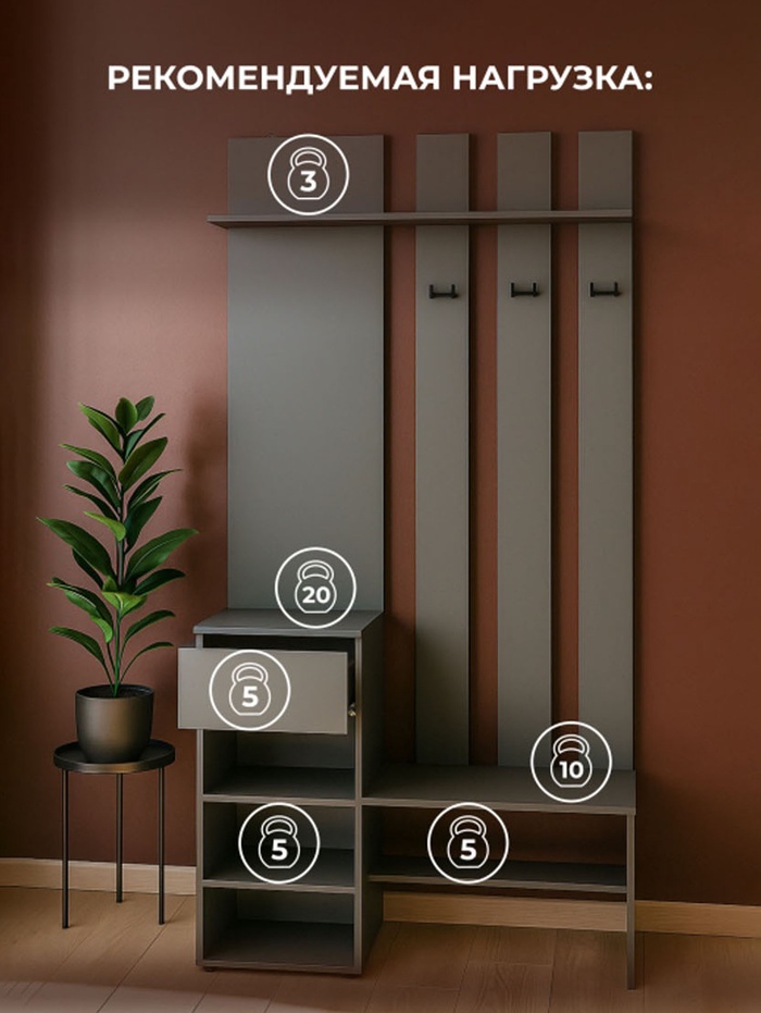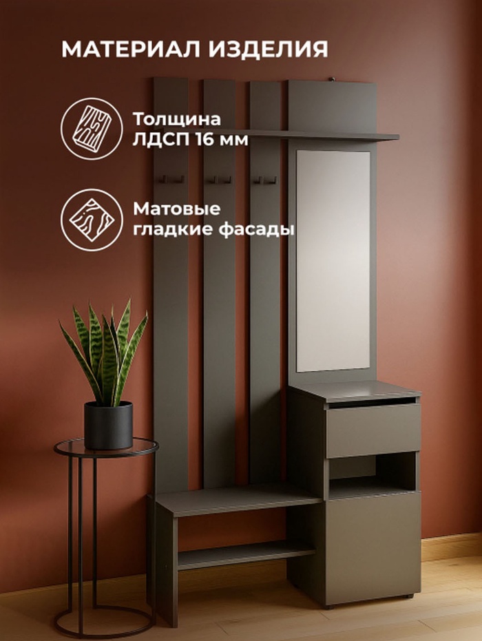 Корпус выполнен из прочного ЛДСП, что обеспечивает долговечность и устойчивость конструкции. Компактные размеры позволяют разместить прихожую даже в небольших помещениях, сохраняя удобство использования и аккуратный внешний вид.