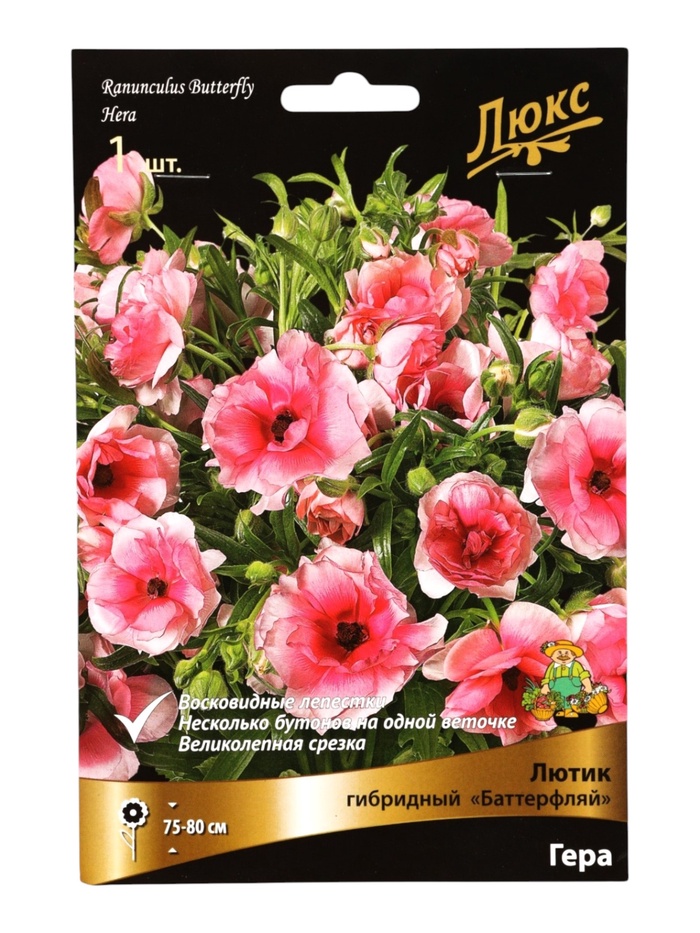 Лютик азиатский «Баттерфляй Гера» - это сорт с изысканными махровыми цветками чистого розового оттенка. Растение высотой 75-80 см формирует стройный куст с прочными цветоносами, идеально подходящий для срезки и создания выразительных акцентов в цветнике.