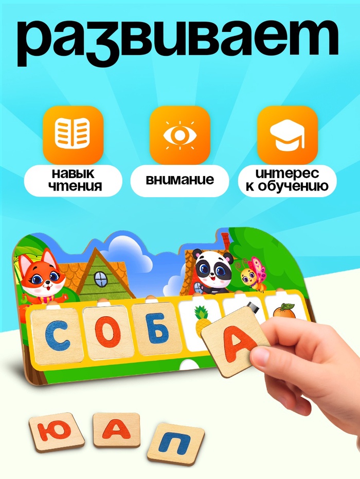 Развивающая игра поможет малышу выучить буквы и слова. В набор входит основа, буквы и деревянная основа. Все элементы выполнены из натурального дерева, а значит, они прочные и безопасные для детей.