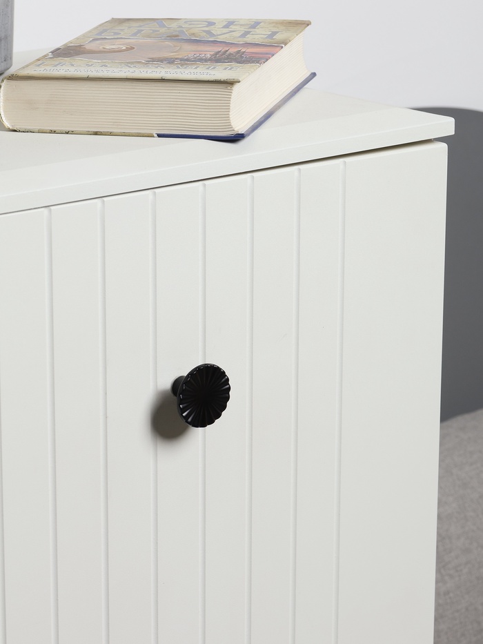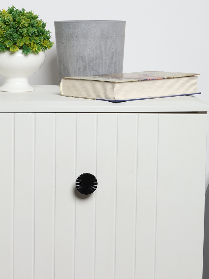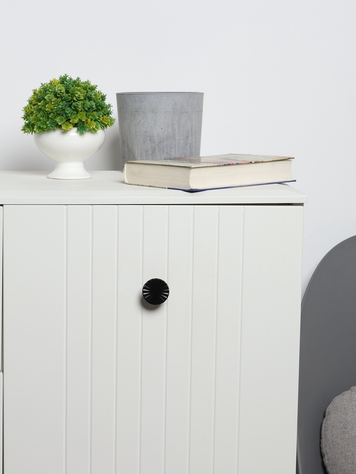 Фигурная ручка-кнопка 36 мм, черный — крупная ручка из металла с матовым черным покрытием. Контрастный цвет создает выразительный акцент на светлых фасадах.