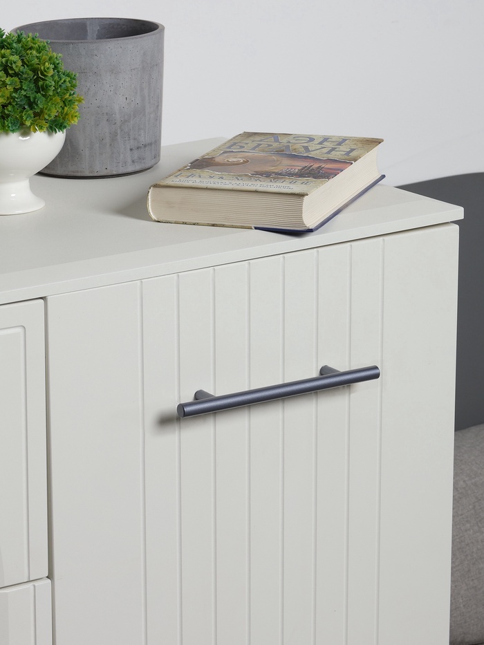 Рейлинговая ручка ТУНДРА, облегченная, графит, 200 мм — это удлиненная круглая ручка из нержавеющей стали для распашных фасадов. Графитовое покрытие создает темно-серый акцент на мебели.