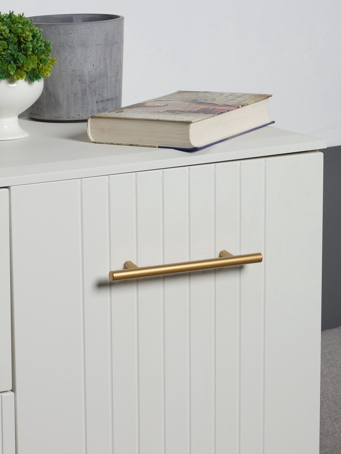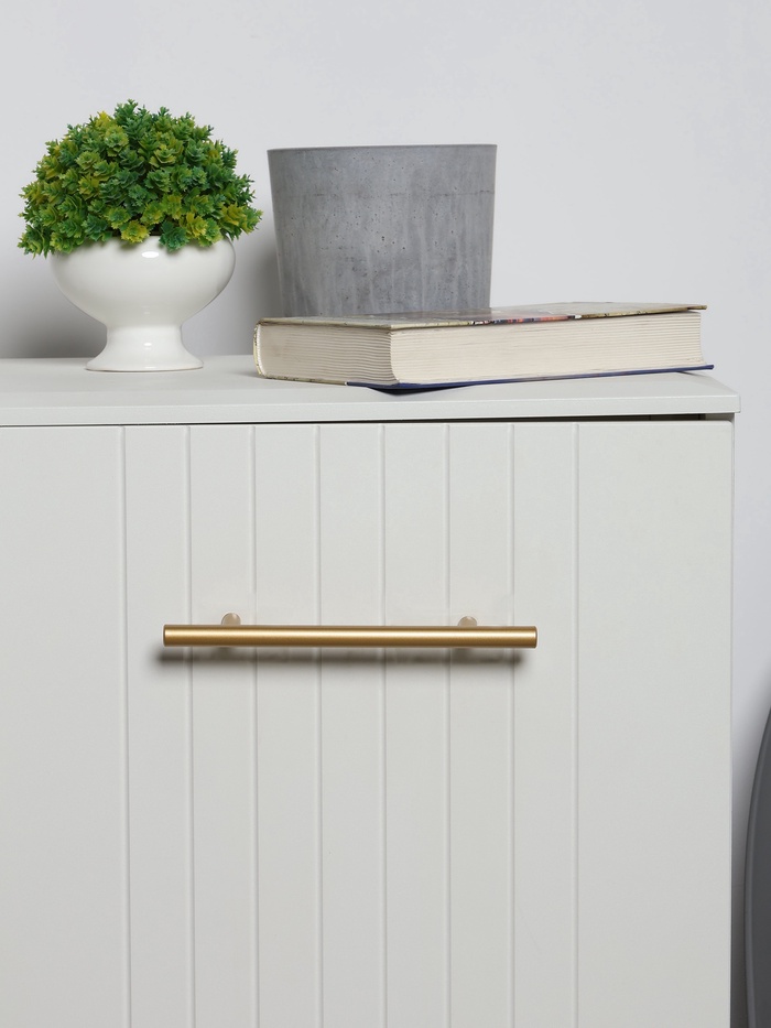 Рейлинговая ручка ТУНДРА, облегченная, золото, 200 мм — это удлиненная круглая ручка из нержавеющей стали для распашных фасадов. Золотое покрытие создает акцентный элемент на мебели.