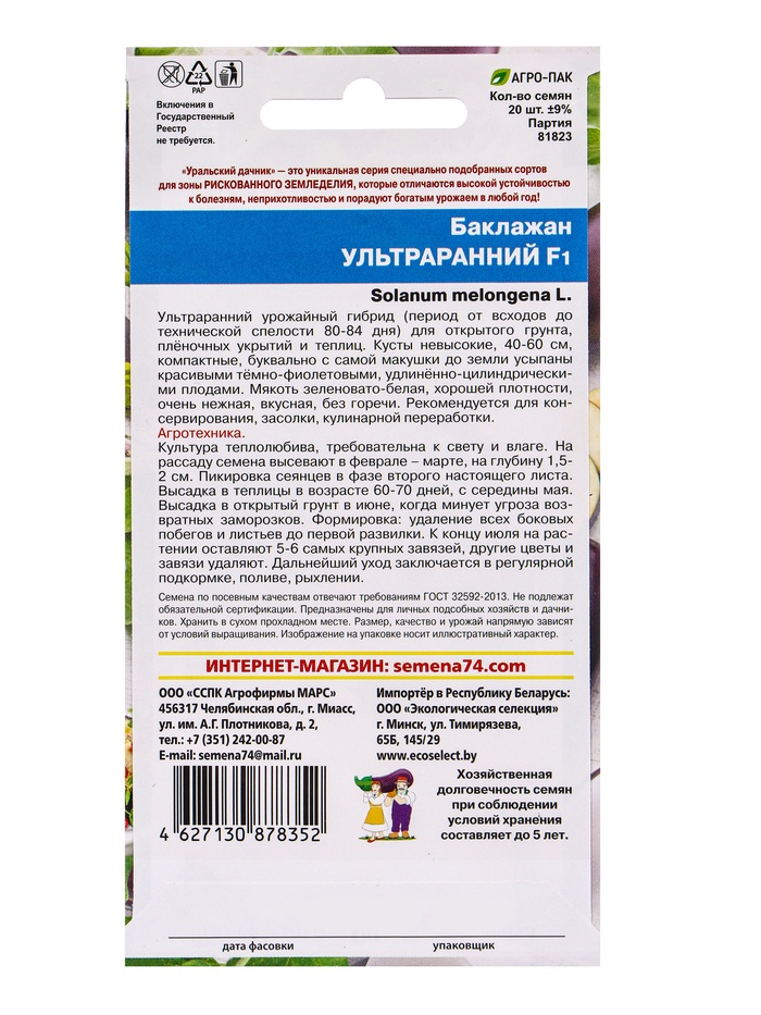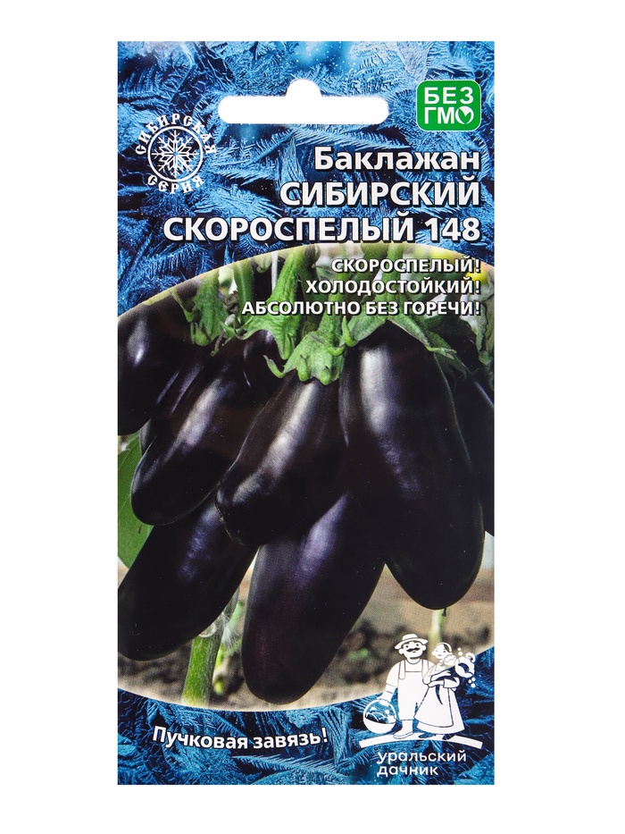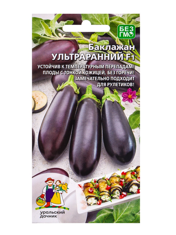 Скороспелый высокоурожайный гибрид из Уральской коллекции баклажанов. В теплице начинает созревать одновременно с самыми ранними гибридами помидоров. Растения невысокие, компактные, буквально с самой макушки до земли усыпаны красивыми тёмно-фиолетовыми плодами. Единственный из коллекции гибрид, который можно выращивать не только в защищённом, но и в открытом грунте.