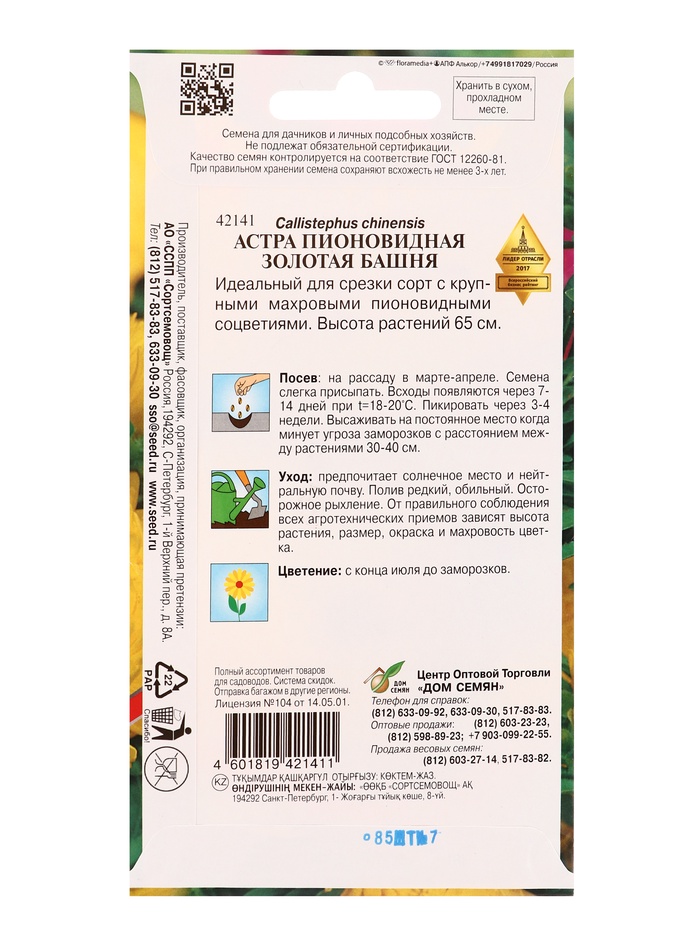 Семена цветов Астра пионовидная «Золотая Башня», 85 семян, «Мой выбор»