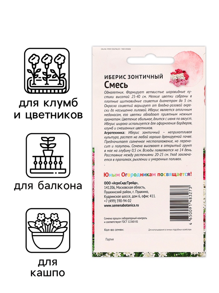 Однолетник. Формирует ветвистые шаровидные кустики высотой 25-40 см. Мелкие цветки собраны в плотные щитковидные соцветия диаметром до 5 см. Окраска соцветий варьирует от бледно-розовой окраски до насыщенно лиловой. Иберис является отличным медоносом, его цветки обладают приятным нежным ароматом. Цветение обильное, длится с июня по август. Иберис широко используется для оформления бордюров, клумб и смешанных цветников. Агротехника: Иберис зонтичный – неприхотливая культура, растет на любой хорошо дренируемой почве. Предпочитает солнечное местоположение, но переносит и полутень. Семена высевают в открытый грунт в мае на глубину 0,5 см. Всходы появляются на 14 день. Расстояние между растениями 20-25 см. Уход заключается в прополках, рыхлении и умеренных поливах. Штрих-код - 4650091483273