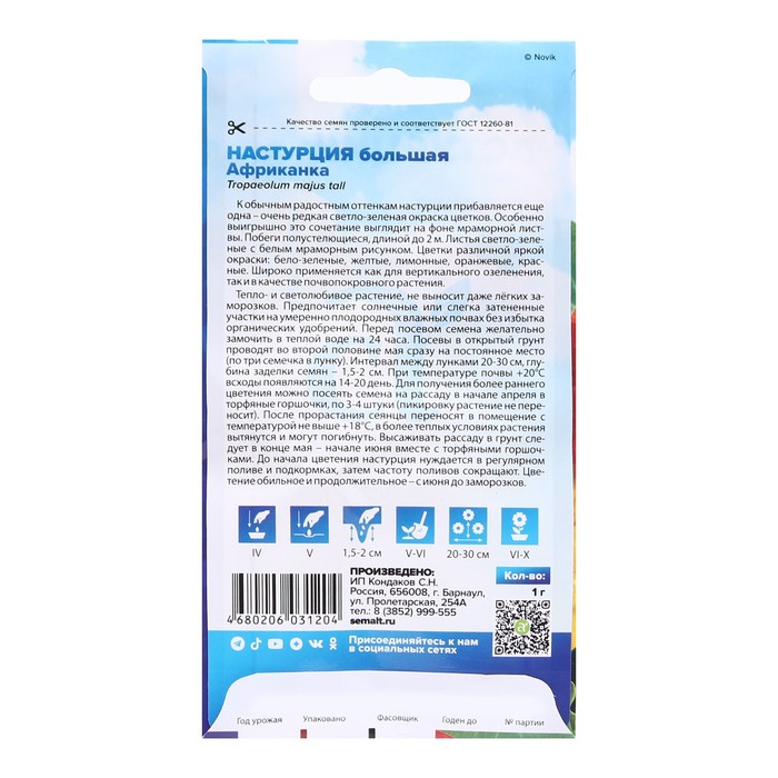 К обычным радостным оттенкам настурции прибавляется еще одна -очень редкая светло-зеленая окраска цветков. Особенно выигрышно это сочетание выглядит на фоне мраморной листвы. Побеги полустелющиеся, длиной до 2 м. Листья светло-зеленые с белым мраморным рисунком. Цветкиразличной яркой окраски: бело-зеленые, желтые, лимонные, оранжевые, красные. Цветение обильное с июня до заморозков. Широко применяется как для вертикального озеленения, так и в качестве почвопокровного растения. Тепло- и светолюбивое растение, не выносит даже лёгких заморозков. Предпочитает солнечные или слегка затененные участки на умеренно плодородных влажных почвах без избытка органических удобрений. Перед посевом семена желательно замочить в теплой воде на 24 часа. Посевы в открытый грунт проводят во второй половине мая сразу на постоянное место (по три семечка в лунку). Интервал между лунками 20-30 см, глубина заделки семян – 1,5-2 см. При температуре почвы +20°C всходы появляются на 14-20 день. Для получения более раннего цветения можно посеять семена на рассаду в начале апреля в торфяные горшочки, по 3-4 штуки (пикировку растение не переносит). После прорастания сеянцы переносят в помещение с температурой не выше +18°C, в более теплых условиях растения вытянутся и могут погибнуть. Высаживать рассаду в грунт следует в конце мая – начале июня вместе с торфяными горшочками. До начала цветения настурция нуждается в регулярном поливе и подкормках, затем частоту поливов сокращают.