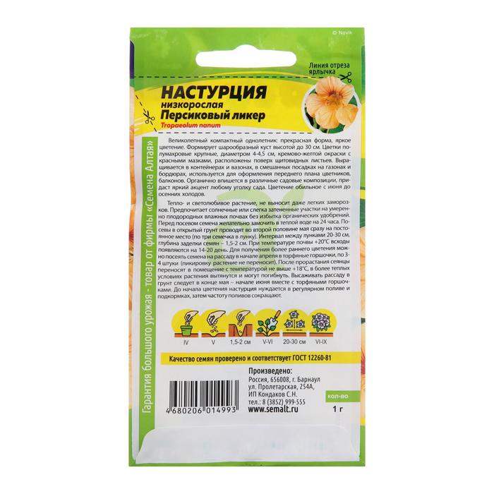 Великолепный компактный однолетник: прекрасная форма, яркое цветение. Формирует шарообразный куст высотой до 30 см. Цветки полумахровые крупные, диаметром 4-4,5 см, кремово-желтой окраски с красными мазками, расположены поверх щитовидных листьев. Выращивается в контейнерах и вазонах, в смешанных посадках на газонах и бордюрах, используется для оформления переднего плана цветников, балконов. Органично впишется в различные садовые композиции, придаст яркий акцент любому уголку сада. Цветение обильное с июня до осенних холодов. Тепло- и светолюбивое растение, не выносит даже лёгких заморозков. Предпочитает солнечные или слегка затененные участки на умеренно плодородных влажных почвах без избытка органических удобрений. Перед посевом семена желательно замочить в теплой воде на 24 часа. Посевы в открытый грунт проводят во второй половине мая сразу на постоянное место (по три семечка в лунку). Интервал между лунками 20-30 см, глубина заделки семян – 1,5-2 см. При температуре почвы +20°C всходы появляются на 14-20 день. Для получения более раннего цветения можно посеять семена на рассаду в начале апреля в торфяные горшочки, по 3-4 штуки (пикировку растение не переносит). После прорастания сеянцы переносят в помещение с температурой не выше +18°C, в более теплых условиях растения вытянутся и могут погибнуть. Высаживать рассаду в грунт следует в конце мая – начале июня вместе с торфяными горшочками. До начала цветения настурция нуждается в регулярном поливе и подкормках, затем частоту поливов сокращают.