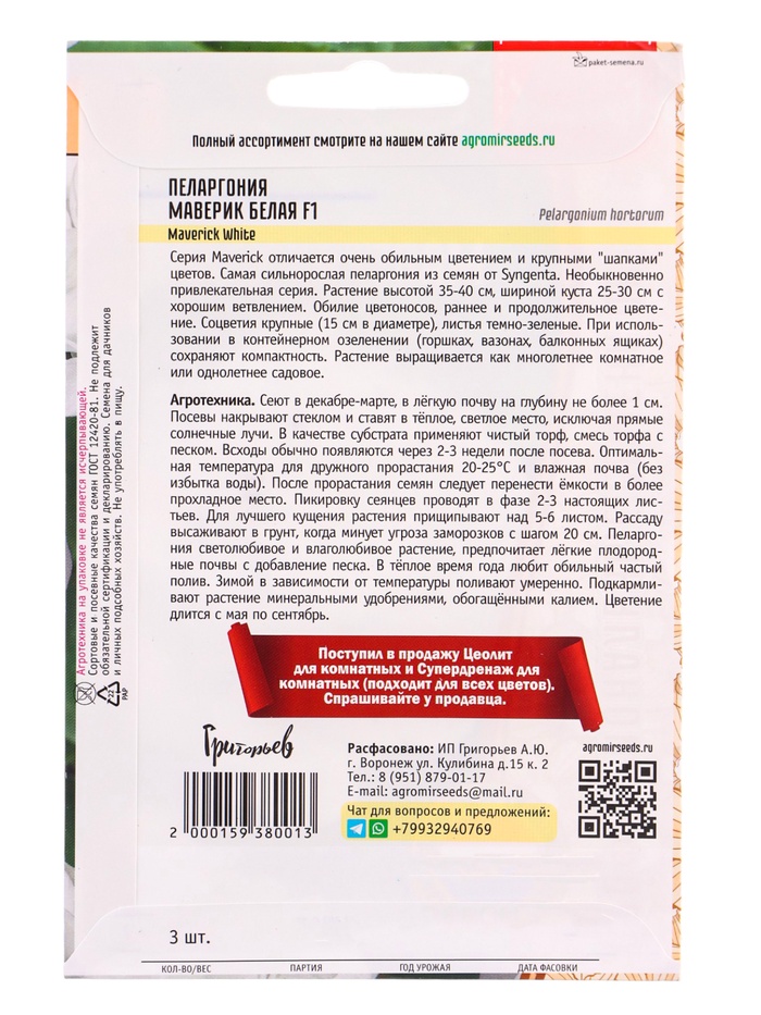 Семена цветов Пеларгония Маверик Белая F1 (Maverick White) 3 шт. 12.29 г.