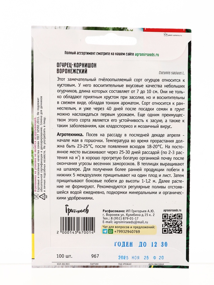 Семена Огурец Воронежский корнишон ВП 100 шт. 12.29 г.