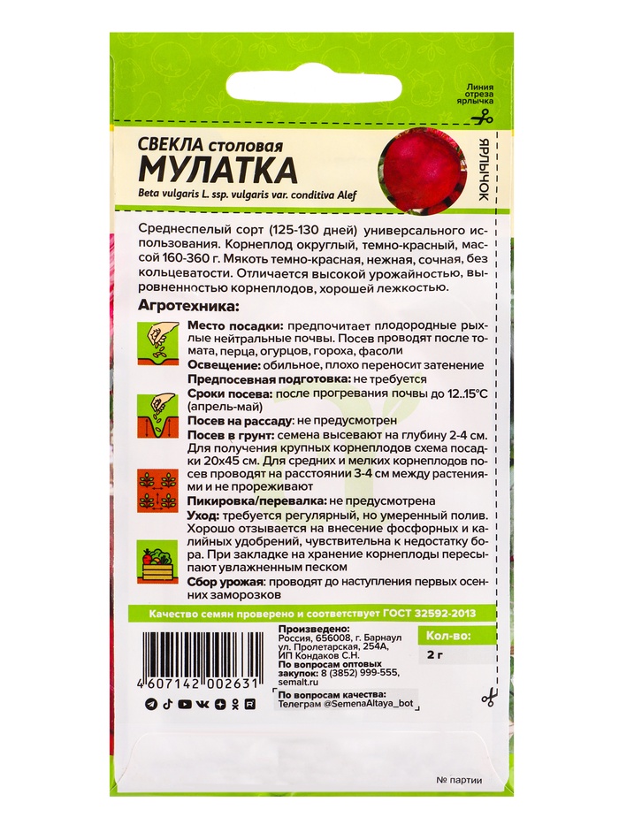 Семена Свёкла «Мулатка», 2 г, «Семена Алтая»