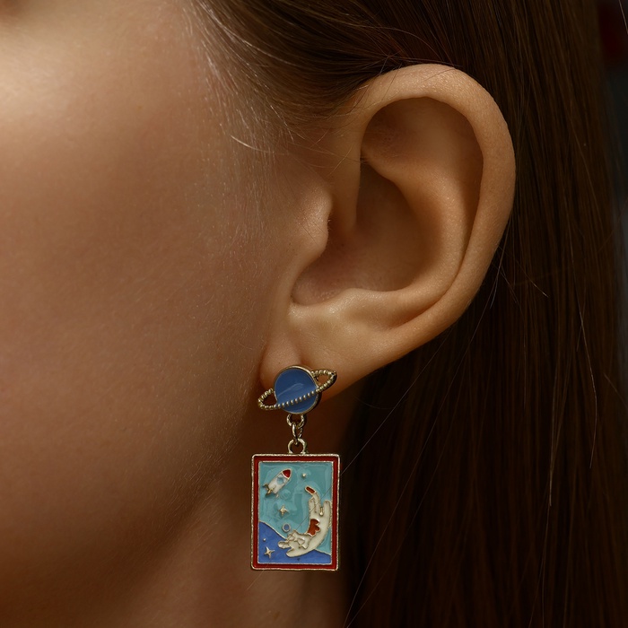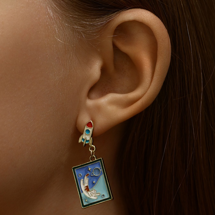 Серьги с эмалью «Космос» и коты, цвет бело-синий в золоте