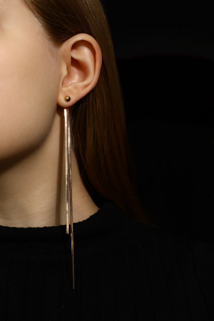 Лёгкие и выразительные серьги длиной 15 см в золотистом оттенке воплощают гармонию минимализма и изящества. Плоские нити, словно струящиеся цепочки, создают эффект плавного движения и подчёркивают утончённость образа, делая украшение заметным, но не перегружающим.