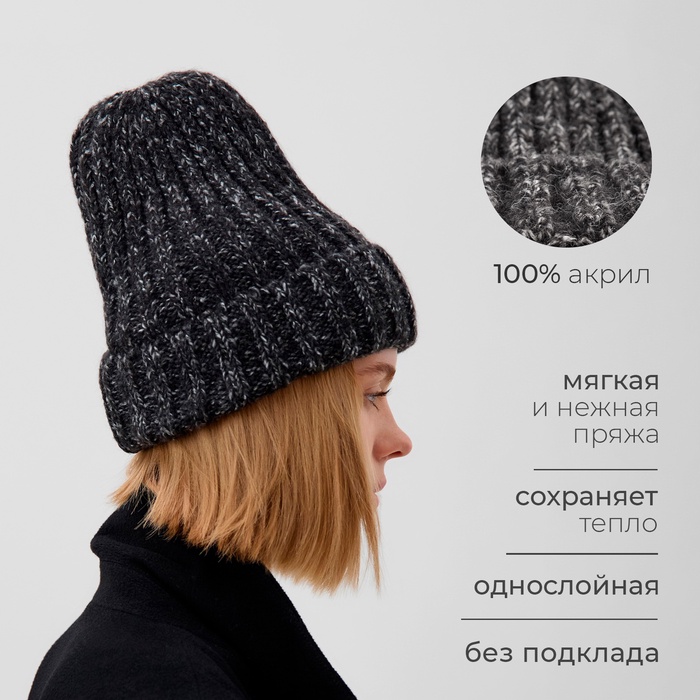 Шапка в рубчик женская с отворотом MINAKU, размер 54-56, чёрная