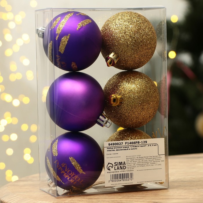 Шары ёлочные «С Новым годом!», пластик, d=6, 6 шт., фиолетовый, золотой