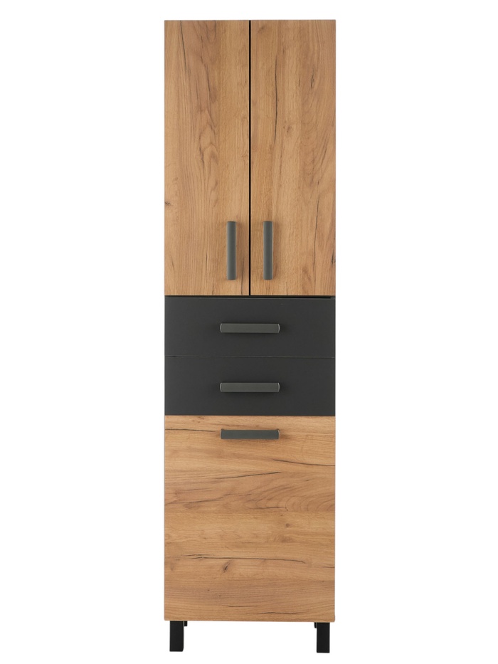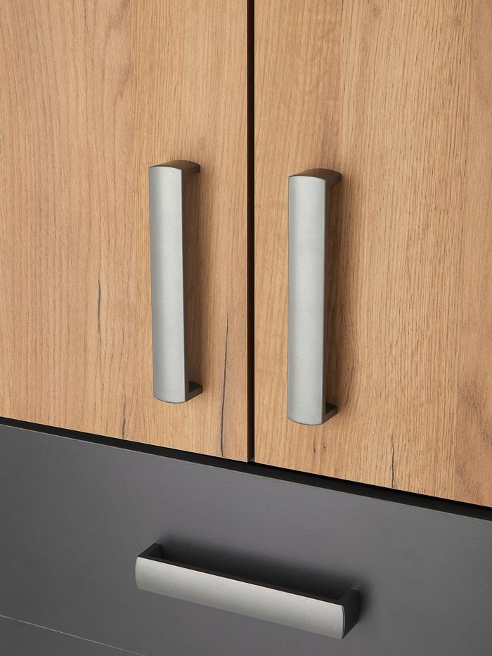 - Контрастный дизайн фасадов: сочетание графита и текстуры дуба добавляет визуальную глубину интерьеру