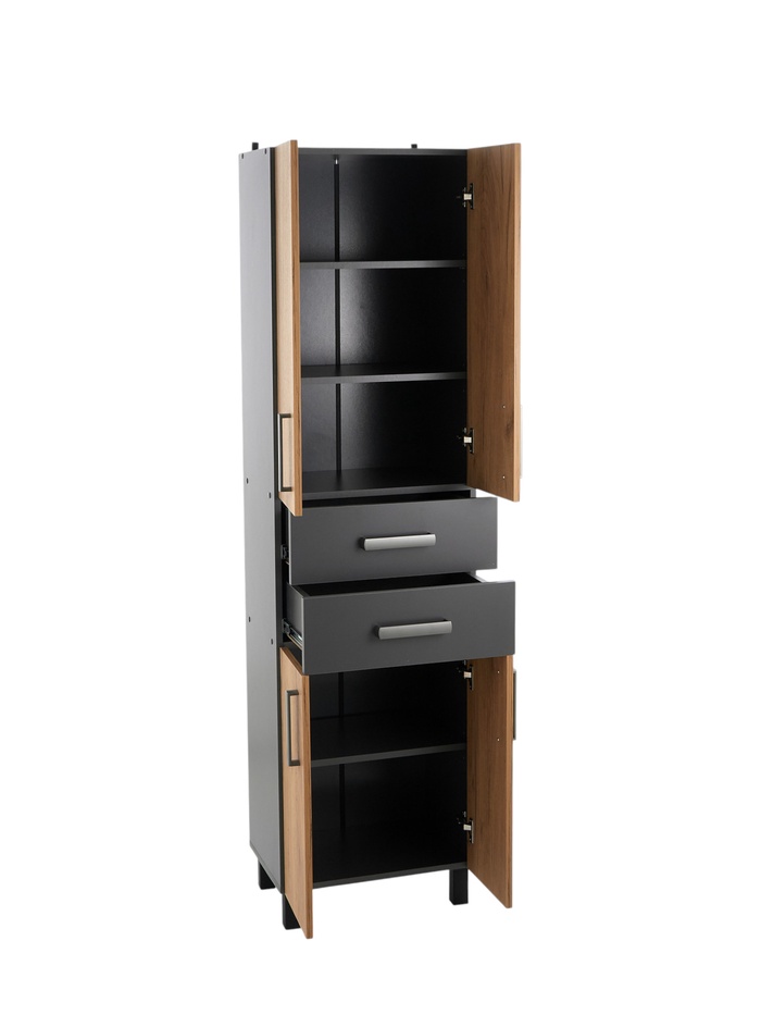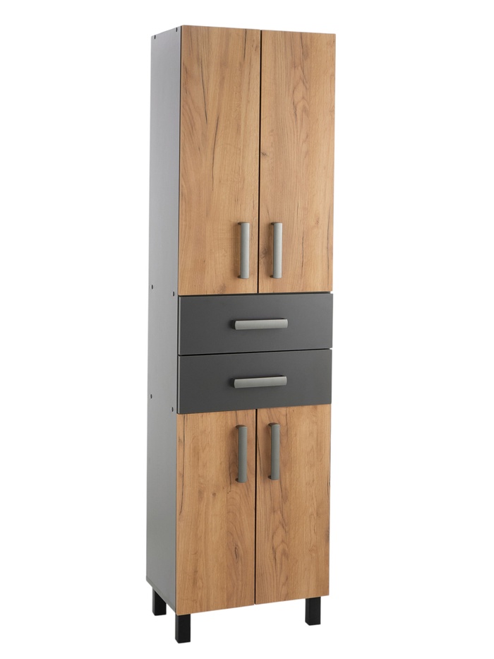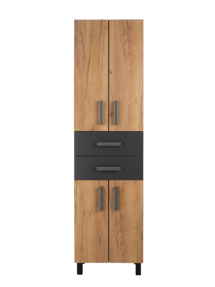 Напольное решение для хранения в ванной, сочетающее закрытые отделения и выдвижные ящики. Подходит для системного размещения текстиля, бытовых средств и аксессуаров, позволяя эффективно использовать вертикальное пространство. Конструкция разделена на зоны хранения для удобного доступа и распределения вещей.