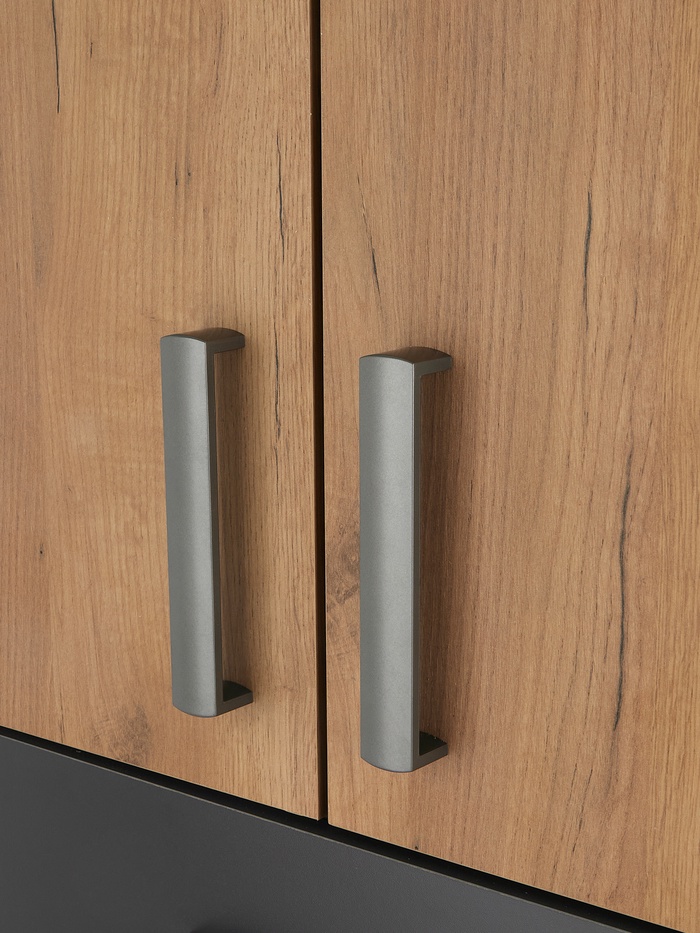 - Контрастное оформление: сочетание графита и дуба подчёркивает современный интерьер