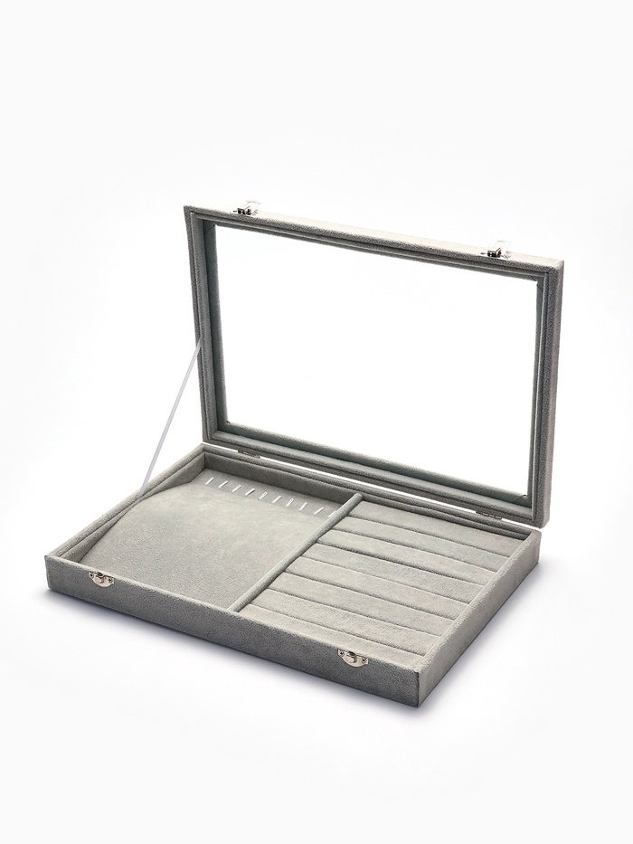 - Стильное решение: сдержанный серый цвет и сочетание стекла с флоком делают шкатулку не только практичной, но и эстетически привлекательной.