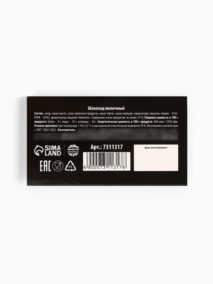 Состав: сухое цельное молоко, какао тёртое, масло какао, сухая молочная сыворотка, обезвоженный молочный жир, сахар, эмульгатор – соевый лецитин, ароматизатор, идентичный натуральному, «Ванилин».
