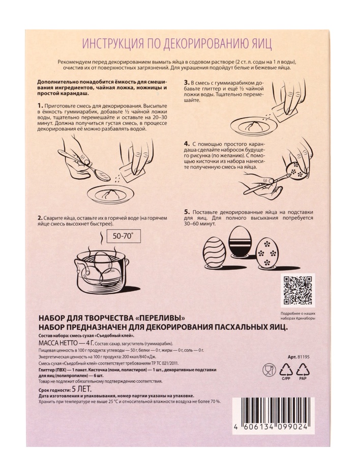 С этими красками вы не просто красите яйца — вы экспериментируете. Нельзя предугадать, какой именно узор родится в этот раз, и в этом — главная радость и волшебство процесса. Это отличный способ увлечь детей подготовкой к празднику, развивая их фантазию, или создать по-настоящему уникальные и красивые пасхальные композиции для украшения стола и подарка близким. «Переливы» дарят не только яркий результат, но и незабываемые совместные эмоции от творчества.