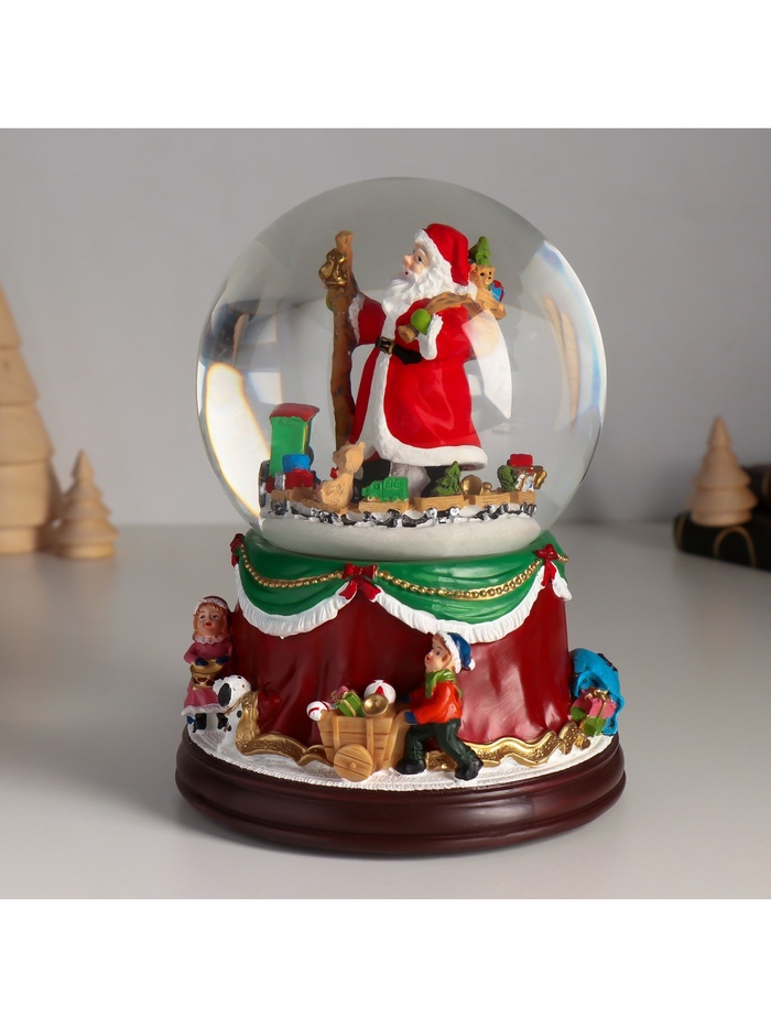 Снежный шар новогодний стеклянный «Дед Мороз и поезд крутится», музыкальный, d=12 см, 13.5×13.5×18 см