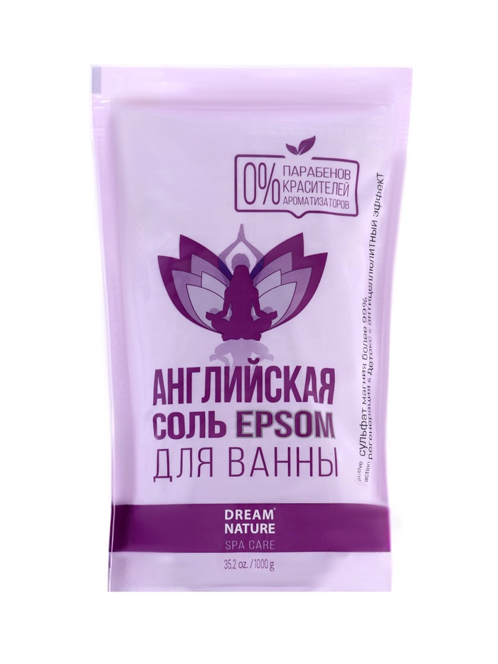DREAM NATURE SPA CARE Английская соль для ванн, 1 кг — натуральный источник магния (99,9%), обеспечивающий комплексный уход за телом и волосами. Соль подходит для ванн, ванночек для рук и ног, а также для скрабов для тела и волос.