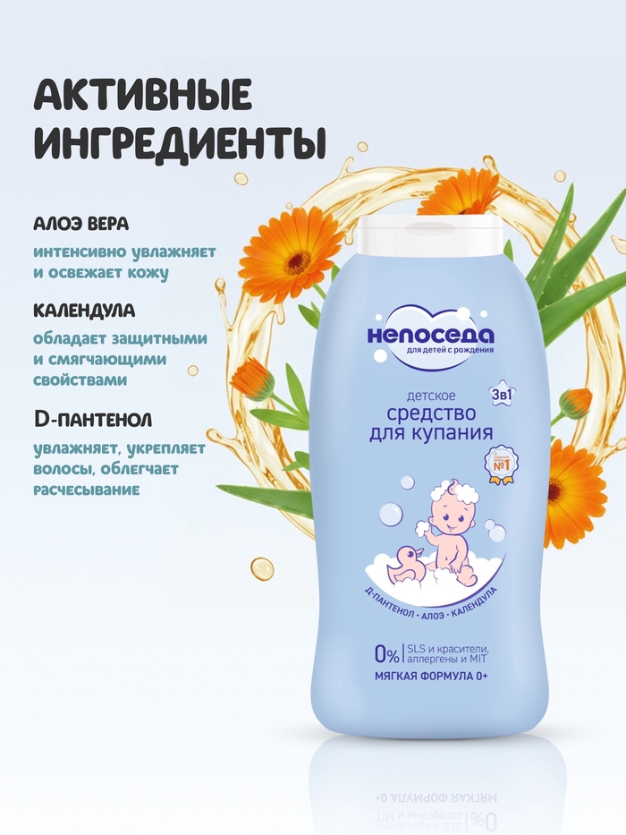 Универсальное средство для купания с календулой и алоэ Непоседа создано специально для ухода за нежной кожей и волосами новорожденных.