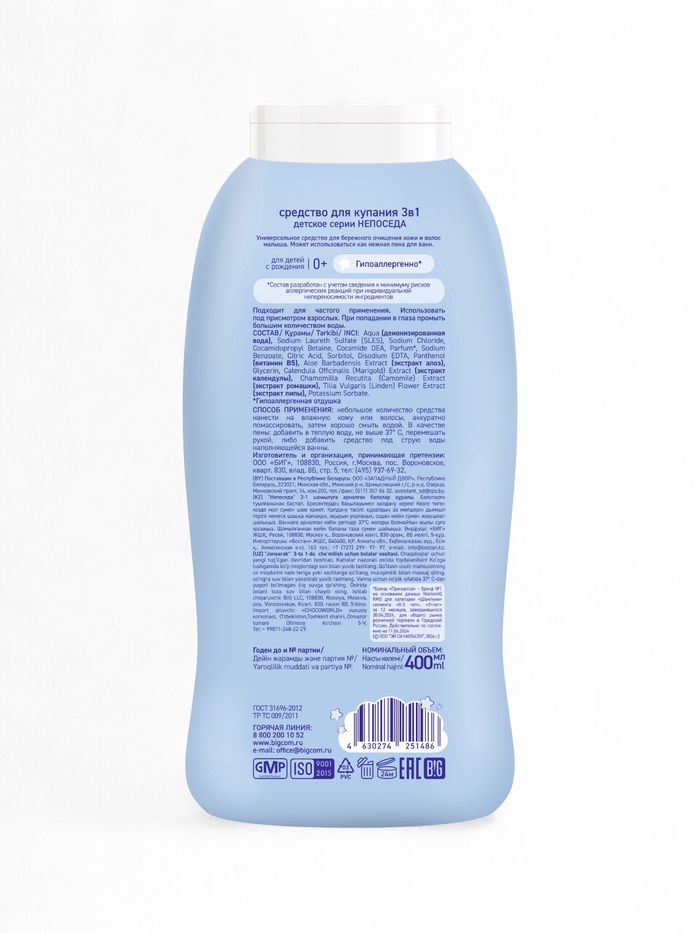 Не сожержит SLS, парабены, метилы, красители и аллергены. Бережное очищение от макушки до самых пяточек, а так же нежная пена для принятия вечерней ванны - все в одном флаконе.