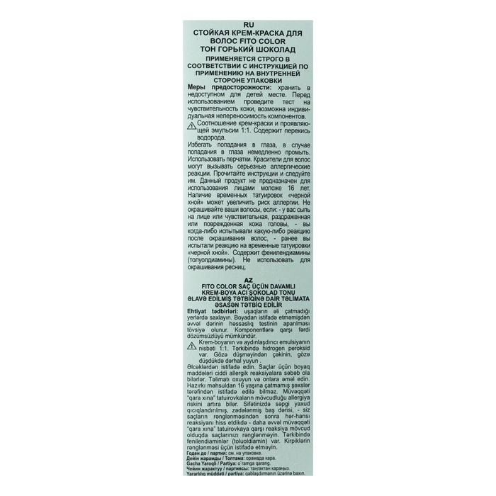 Крем-краска: Aqua, Cetearyl Alcohol, Ceteareth-23, Ricinus Communis Seed Oil (касторовое масло), Juglans Regia Seed Oil (масло грецкого ореха), Urtica Dioica Extract (экстракт крапивы), Glycerin, Ethanolamine, Xanthan gum, Triethylamine, Parfum, Toluene-2,5-diamine, p- Aminophenol, 1-naphthol.