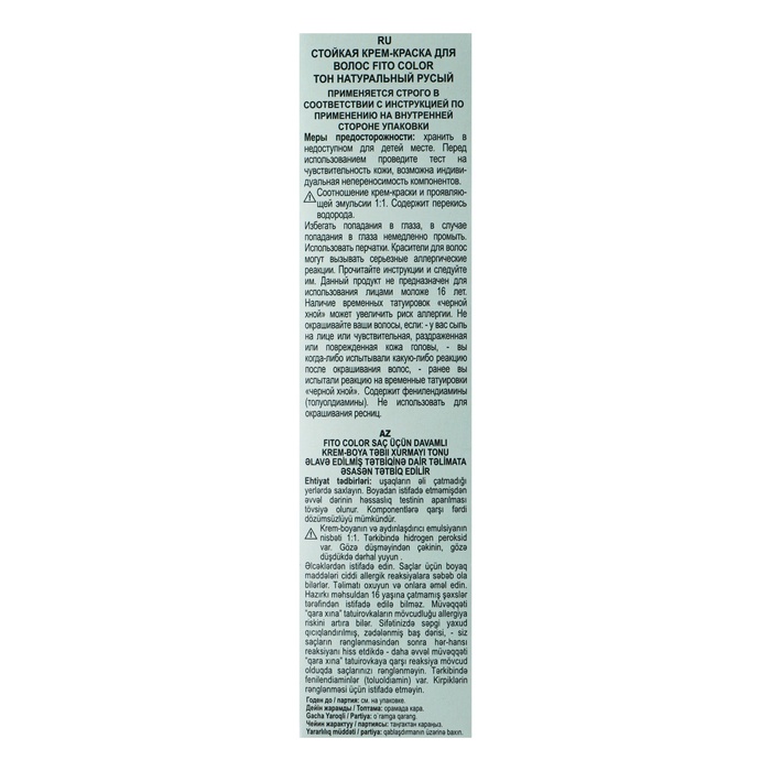 Крем-краска: Aqua, Cetearyl Alcohol, Ceteareth-23, Ricinus Communis Seed Oil (касторвое масло), Argan Oil (масло арганы), Gossypium Herbaceum Seed Extract (экстракт хлопка), Glycerin, Ethanolamine, Xanthan gum, Triethanolamine, Parfum, Toluene-2,5-diamine , p- Aminophenol, 4-Amino-2-Hydroxytoluene.