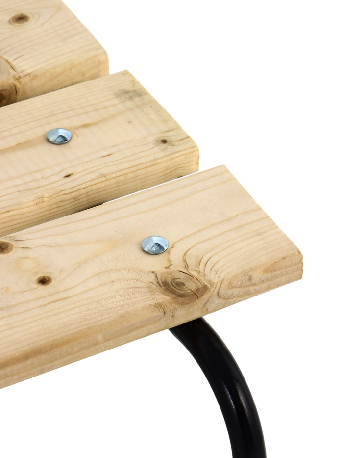 - Деревянное сиденье и спинка: натуральная фактура подчёркивает стиль и поддерживает атмосферу загородного участка.