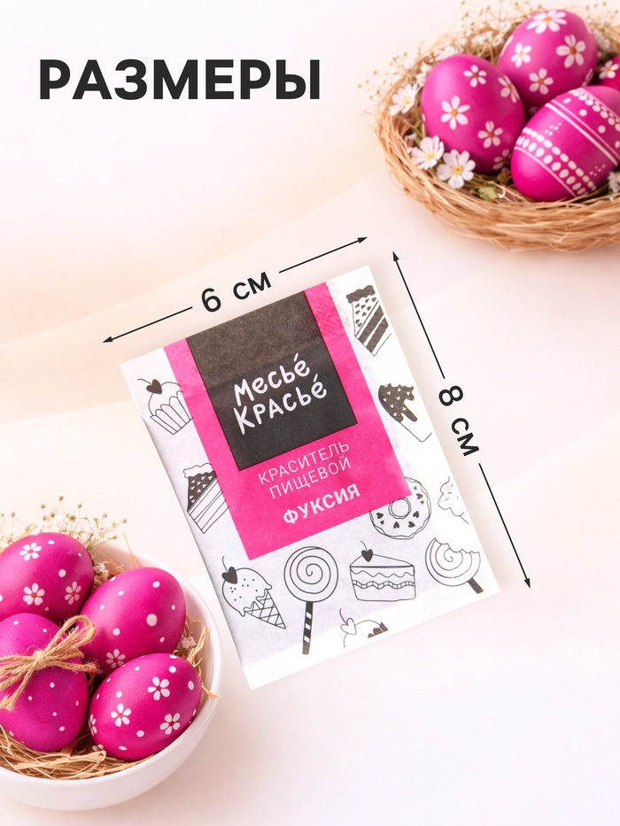 - Универсальность применения: Краситель подходит не только для яиц. Добавьте его в глазурь для куличей, чтобы получить ярко-розовые потёки, используйте для окрашивания мастики, крема, безе, теста для пряников. Отлично подходит для девичников и детских праздников.