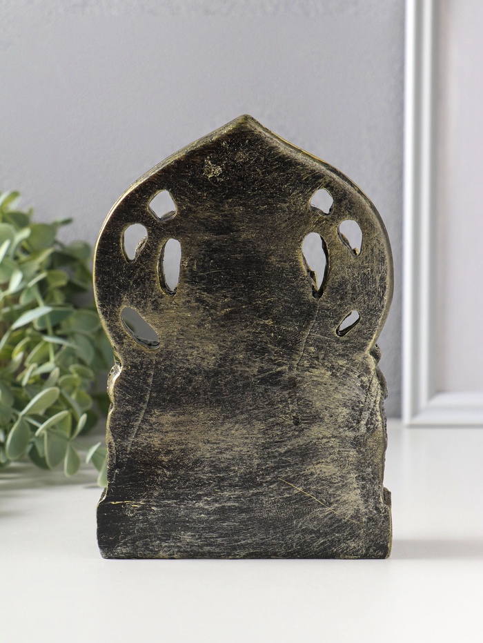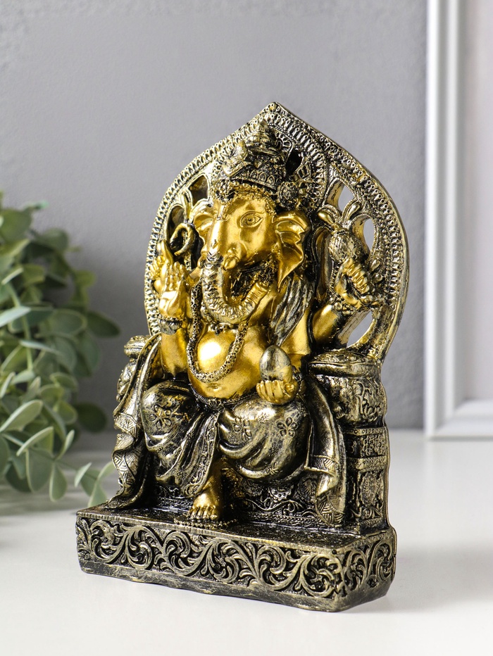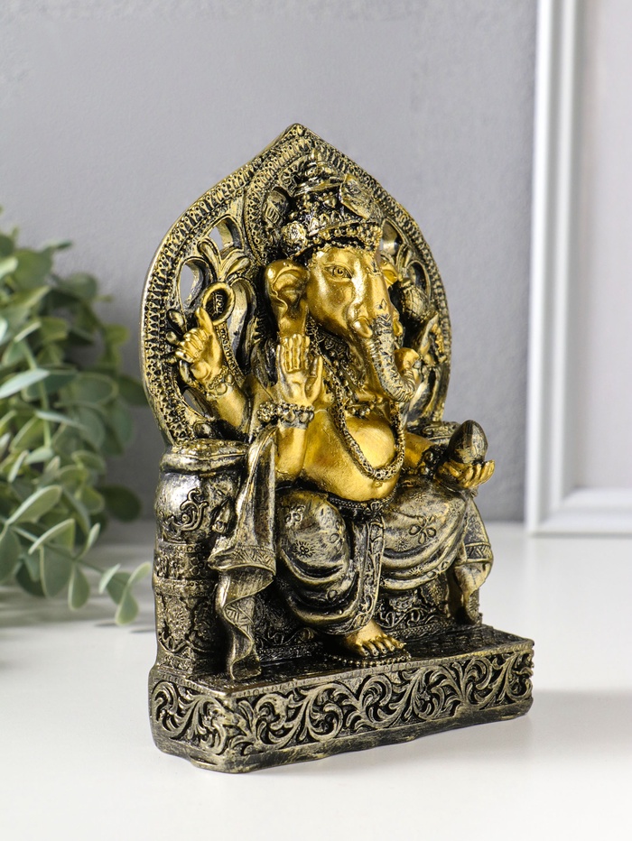 Сувенир полистоун "Ганеша на резном троне" золотая бронза 4х11,7х17,3 см
