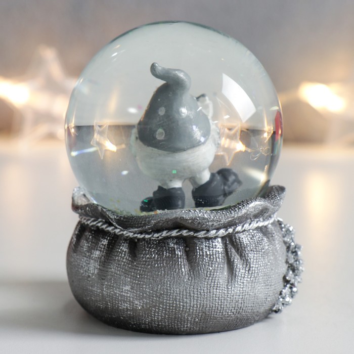 Сувенир полистоун водяной шар "Дед Морозик с подарками" серебро 7х6,7х8,8 см