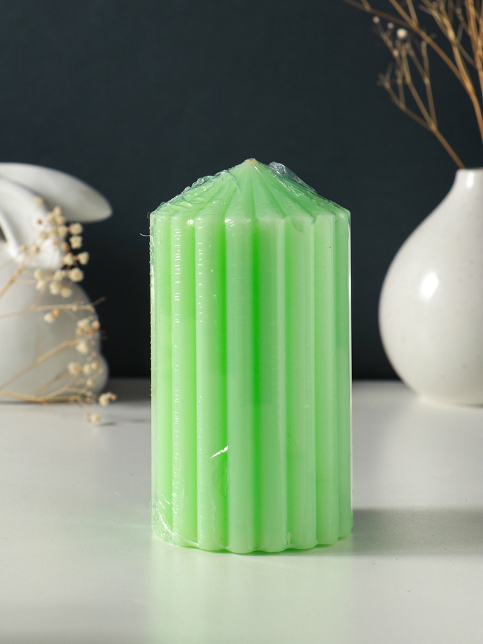 Эта высокая цилиндрическая свеча — строгий акцент для интерьера. Её чистые линии и рифлёная текстура создают игру света, а мягкий оттенок мяты добавляет спокойствия в обстановку. Свеча изготовлена из качественного парафина для ровного и долгого горения.