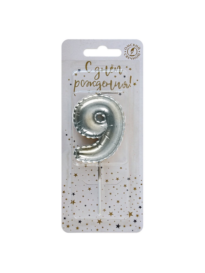 Свеча в торт на шпажке "Воздушая цифра", цифра "9", серебро