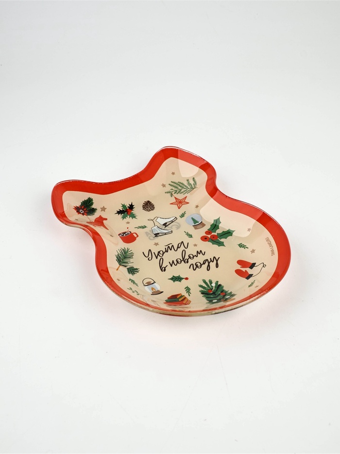 Новогодняя стеклянная тарелка в форме банта размером 13,5 x 18 см — это стильное и функциональное украшение для вашего праздничного стола.